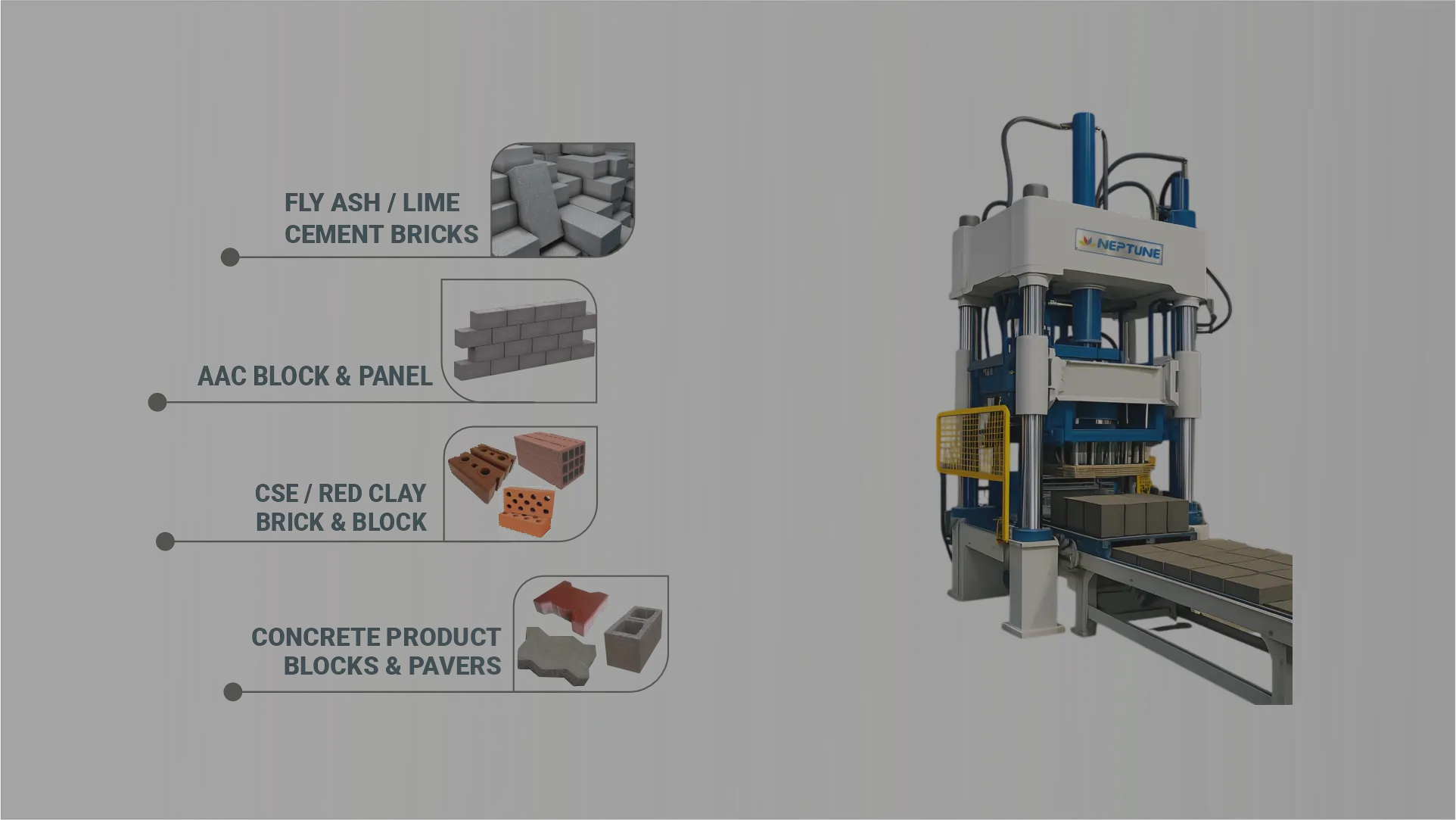 Neptune offers advanced servo-type Vibro-Compacting Pressing Technology for Bricks, Blocks & Pavers. With 5,000–2,00,000 units/day capacity, it ensures optimal compaction, high strength & precision for superior construction quality.